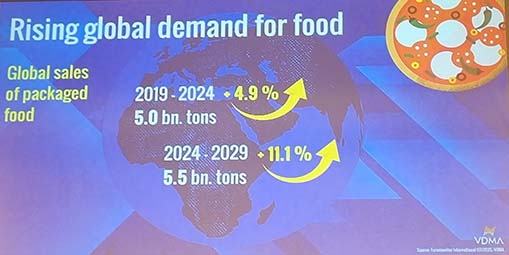 “Nos setores de alimentos embalados e farmacêuticos, o impacto nas vendas de alimentos, processos, máquinas e embalagens é direto — e as perspectivas são bastante positivas diante dos dados e da demanda observada. Entre 2019 e 2025, o crescimento foi de quase 5%, e o Instituto Euromonitor projeta que, nos próximos cinco anos, esse avanço ultrapasse 11%. Esse movimento é impulsionado por fatores como o aumento da população global, a expansão da urbanização, o crescimento das taxas de emprego e a elevação da renda média. Ainda assim, o ritmo varia conforme a região. Em 2024, a produção global de alimentos aumentou cerca de 900 milhões de toneladas, e a expectativa é de que continue em alta até 2029”, enfatizou Richard Clemens, diretor-executivo da VDMA – Associação Alemã de Fabricantes de Máquinas e Instalações Industriais.