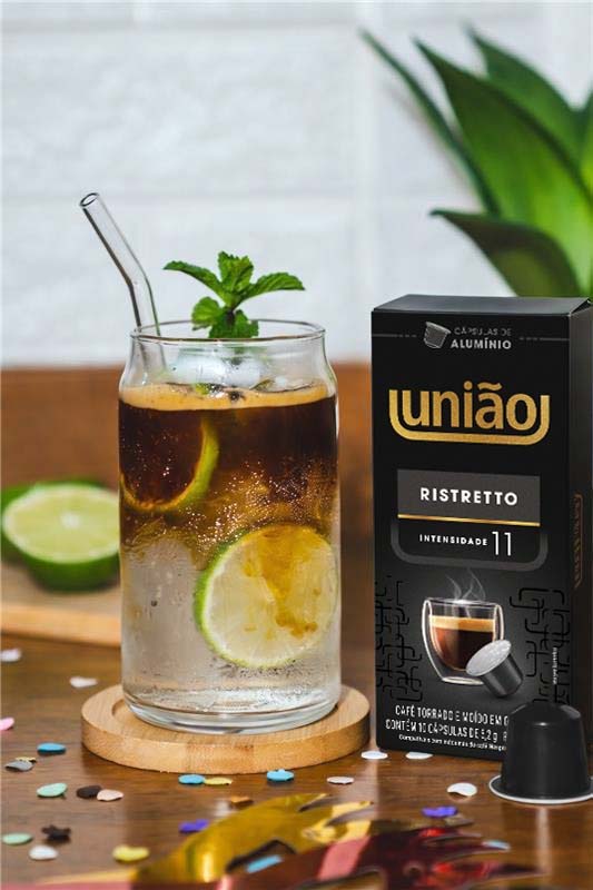 2. Em seguida, adicione o gelo, a água com gás e por último a cápsula de Café Espresso União Ristretto curto.