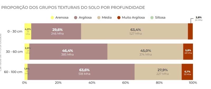 Os resultados mostram que mais da metade do Brasil (63,4%) possui textura média na camada superficial (0–30 cm). Solos argilosos aparecem em segundo lugar (29,6%), enquanto as texturas arenosa, siltosa e muito argilosa somam apenas 7% do território nacional. A distribuição das texturas varia entre os biomas: na Mata Atlântica, 52% dos solos superficiais são muito argilosos, uma proporção bem diferente de biomas como Caatinga, Cerrado e Pampa, onde predomina a textura média. Já entre 60 e 100 cm de profundidade, o país torna-se majoritariamente argiloso (63,6%).