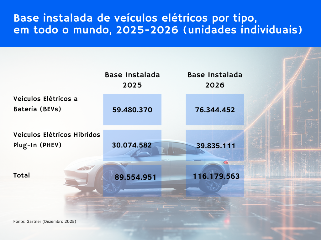 Em 2026, 116 milhões de veículos elétricos (EVs) – carros, ônibus, vans e caminhões pesados – deverão estar em circulação, de acordo com o Gartner, empresa de insights de negócios e tecnologia.